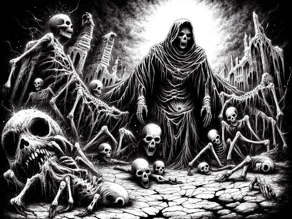 <lora:Veil of Nightmares:1.0> <lora:Death Cover:1.0> Graphic art horror, A highly detailed, grayscale vector illustration in the style of black metal album art depicts a towering, skeletal figure draped in a tattered, dark robe. The figure’s skull-like face is contorted in a menacing expression, with ...
