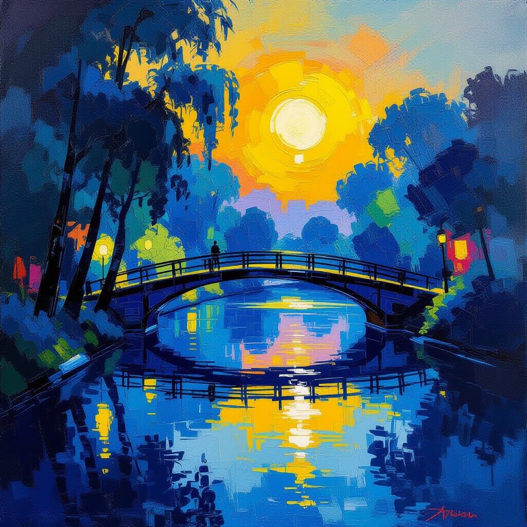 This image showcases vibrant blue and yellow hues in an avant-garde style. Evoking a blend of impressionist techniques and surreal futuristic aesthetics with bold brushstrokes and neon accents.