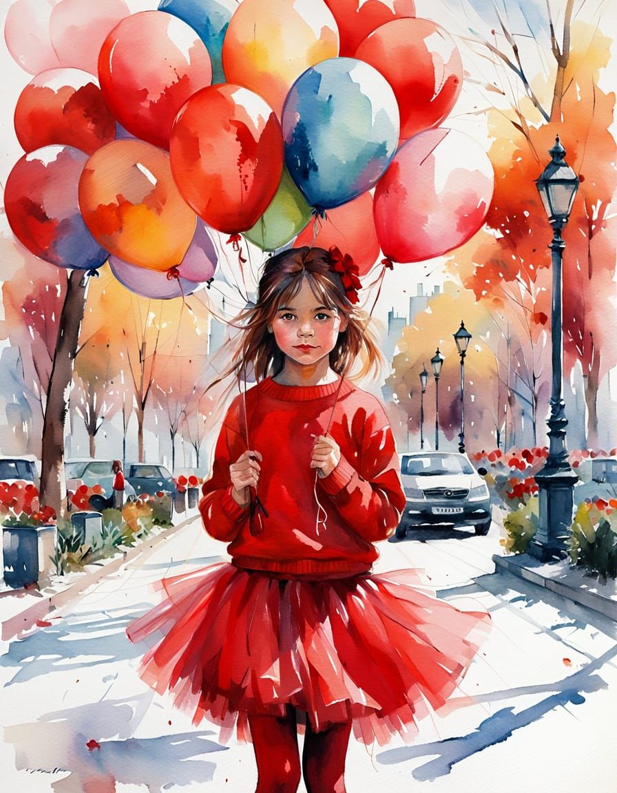 A watercolor painting of a cute young girl holding colorful balloons in a city park. The artwork is highly detailed with a soft wash effect, in the style of contemporary watercolor artists.