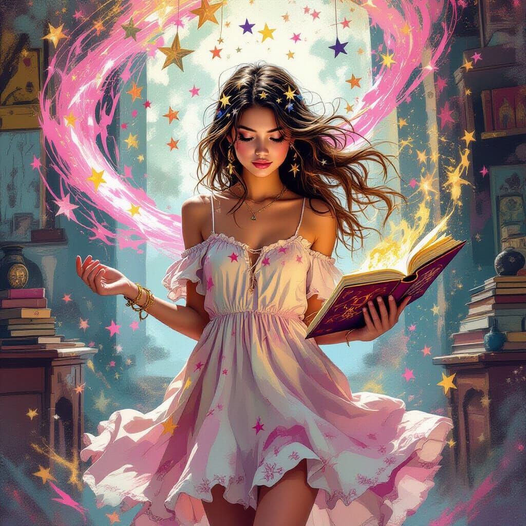This image features a teenage girl with stars in her hair, a floating magical book, and a boho style in a fantasy room. It's rendered with bold, textured brushstrokes like graffiti and spray paint.