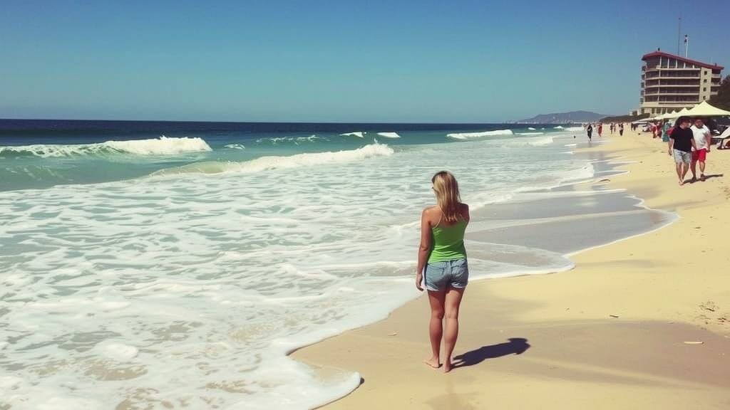 This professional photograph captures a solitary figure on a sandy beach, with eyes gazing towards the water. The image features soft bokeh effects and natural lighting, evoking a sense of wistful reflection.