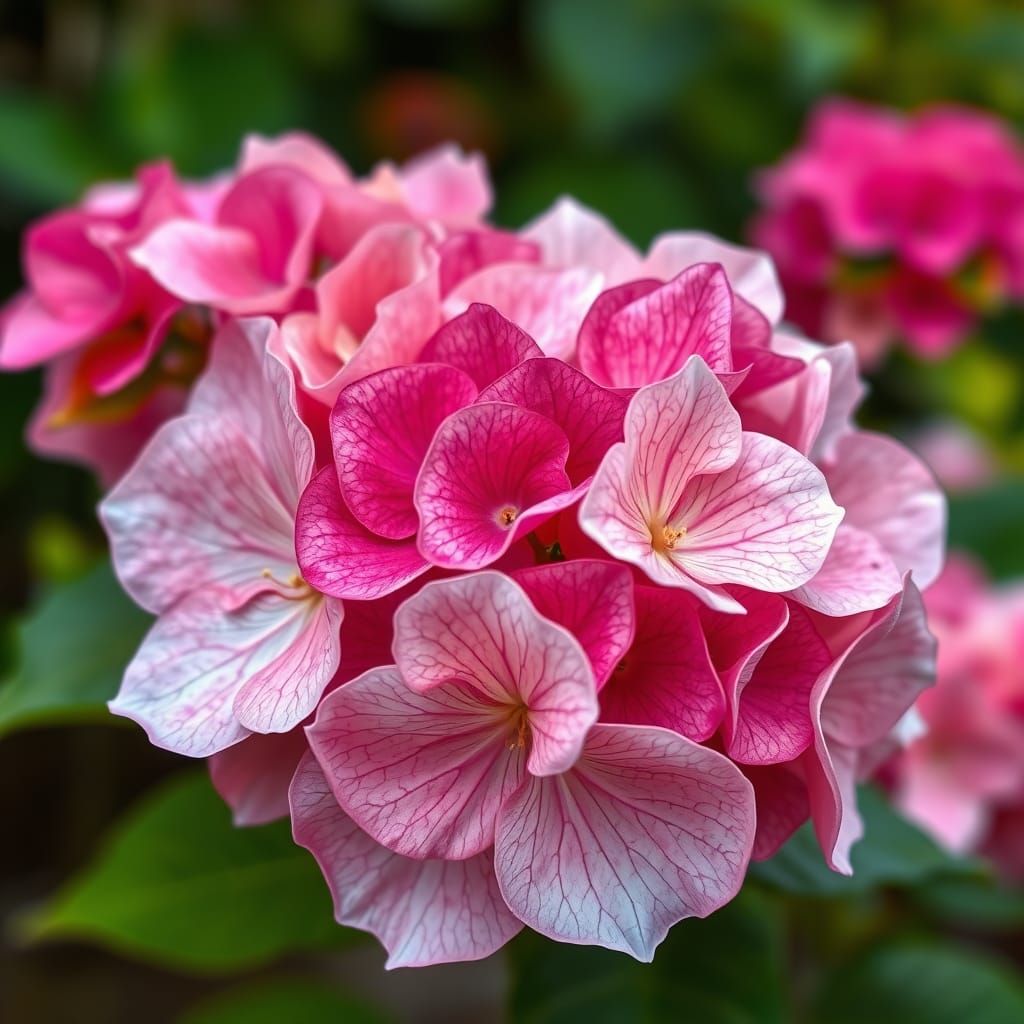 This image showcases vibrant, large-scale hydrangeas with delicate petals and subtle texture, set against a blurred natural background, in exquisite botanical accuracy and photorealistic detail, reminiscent of high-end scientific illustrations and luxurious wallpaper designs.