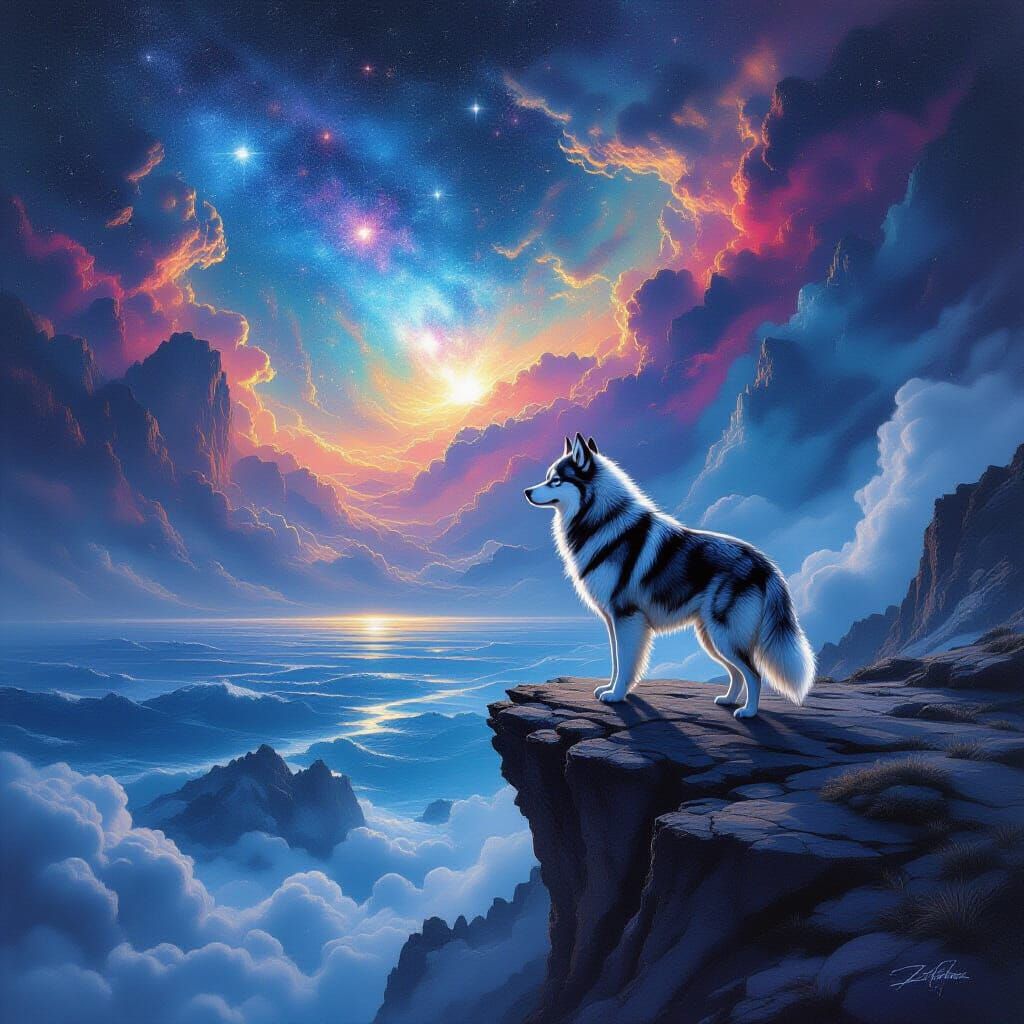 This image shows a majestic husky with starlight fur on a nebula-strewn cliff above a cosmic ocean. Rendered in a detailed charcoal drawing style with dramatic lighting and mist, it captures celestial wonder.