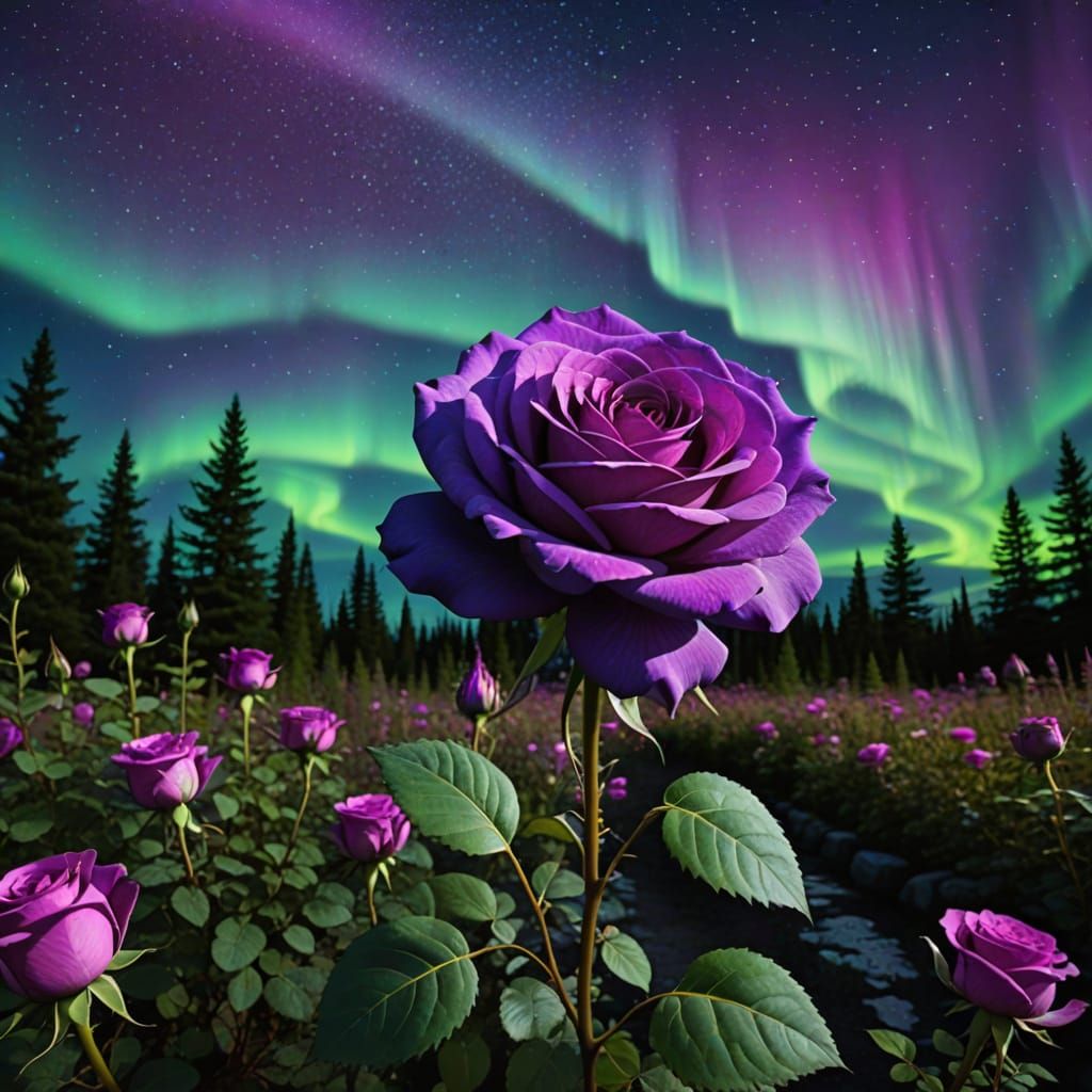 This image showcases a colossal purple rose blooming in an enchanted garden beneath the vibrant spectacle of the aurora borealis.