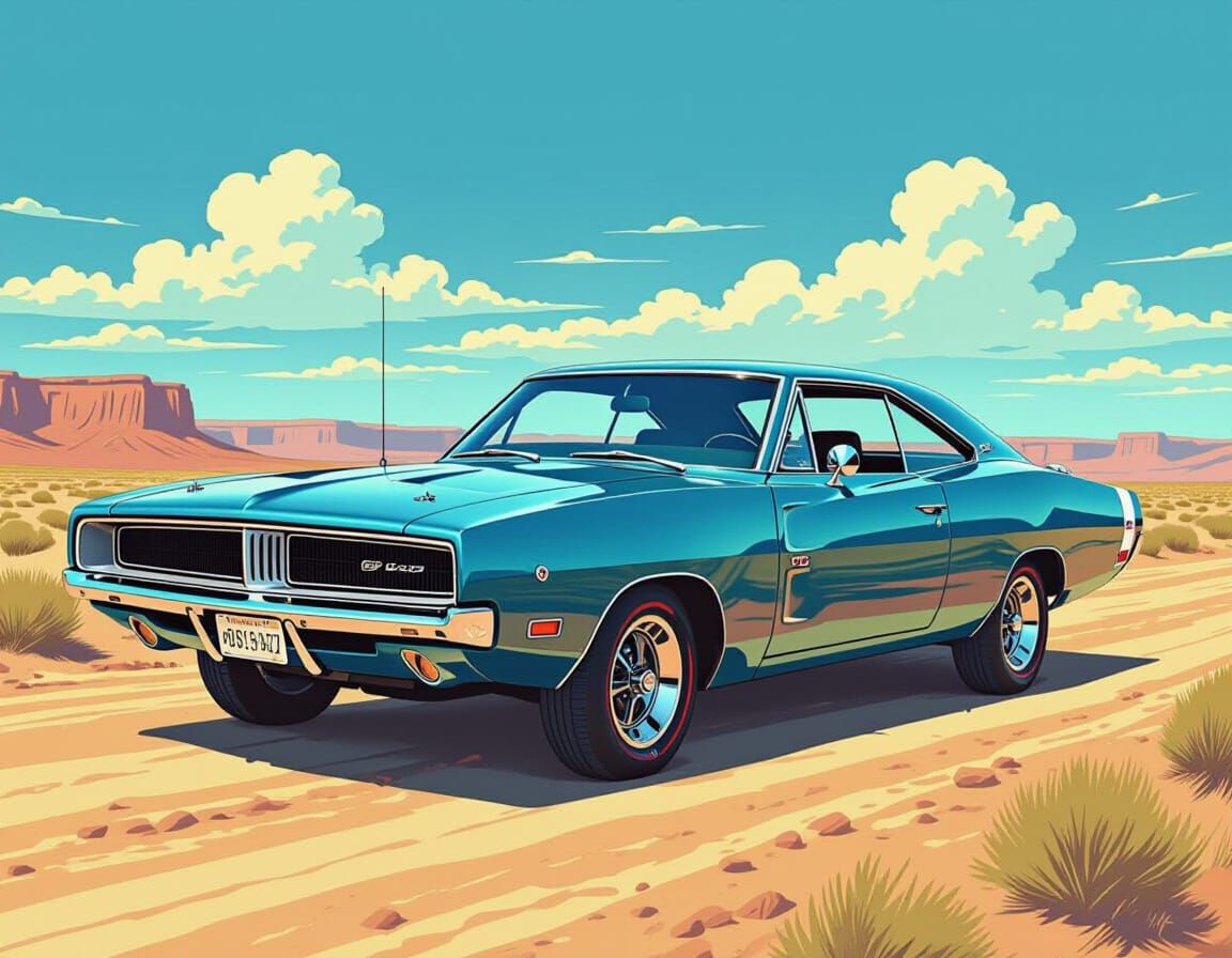This image showcases a detailed 1969 Dodge Charger R/T in metallic blue, parked on a dusty Southwest road. The style blends photorealism with classic comic art, featuring bold lines and vivid colors for a nostalgic feel.
