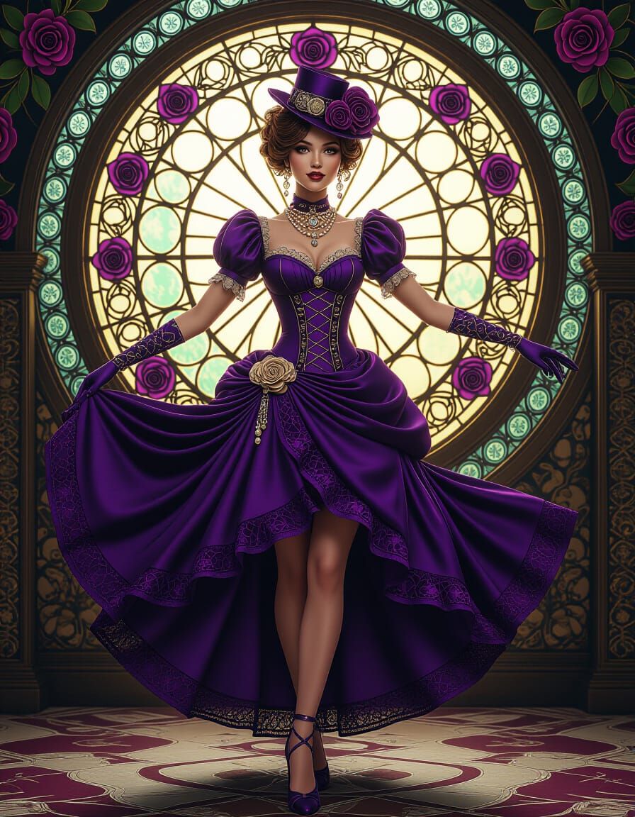 This image showcases a detailed matte painting of a steampunk woman in a purple dress, adorned with roses, lace, and pearls. The artwork features deep colors and intricate detail, presented in 8k resolution.