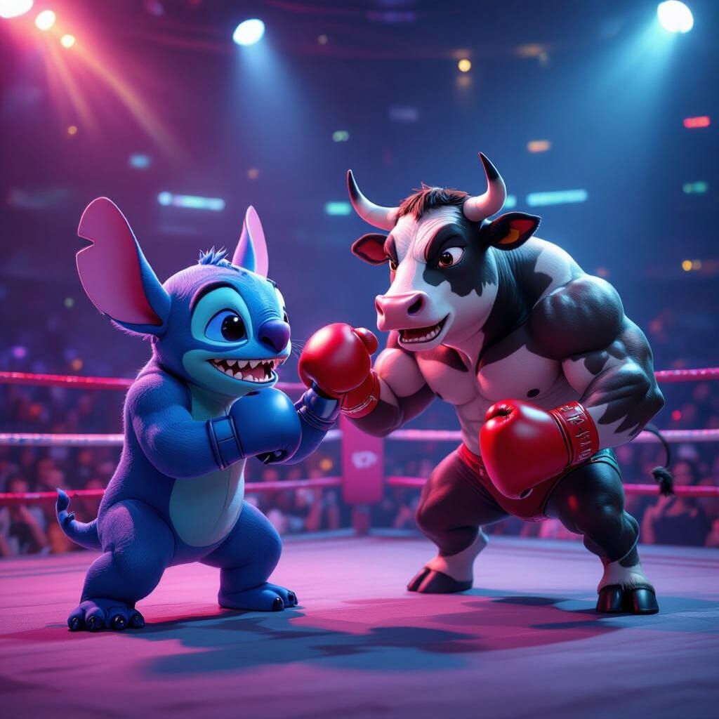 A photorealistic image shows Stitch from Lilo & Stitch in an intense boxing match against a muscular cow. The scene is set in a vibrant, neon-lit underground arena with dynamic lighting and cinematic rendering.