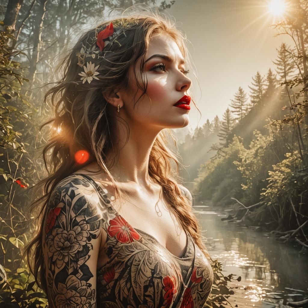 A striking picture of a young woman's face with tattoos. Sunshine illuminates her red lips and eyes in this image with a woodcut style.