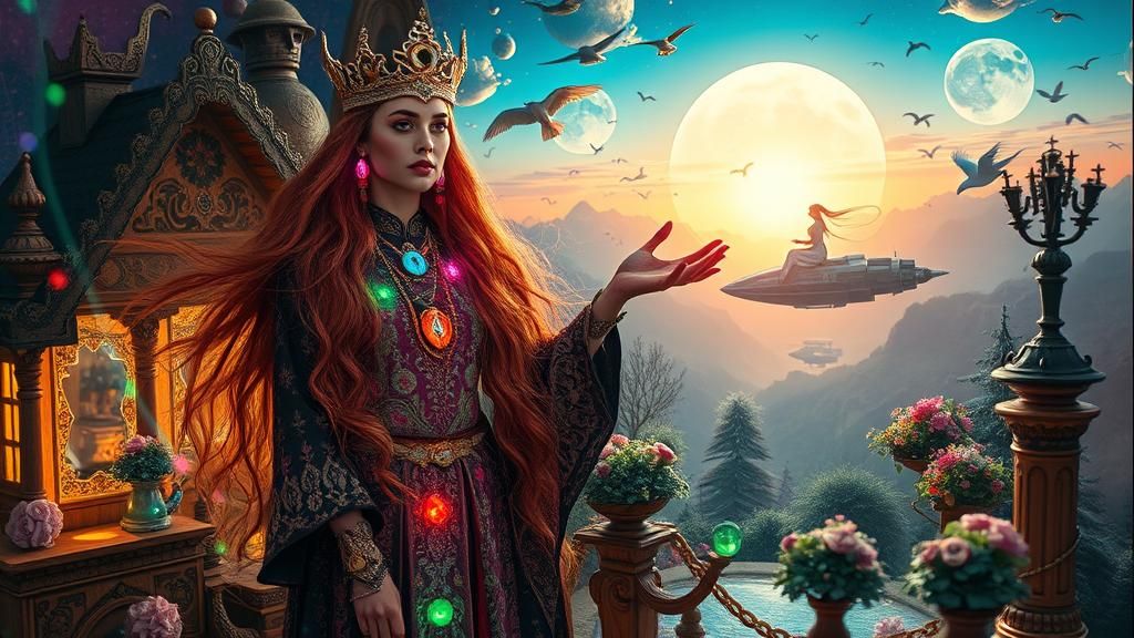A surreal image of a sorcerer in a dollhouse setting, surrounded by mythical creatures. The artwork features elaborate accessories and vibrant energy in a Bio Art style, reminiscent of dreamlike surrealism.