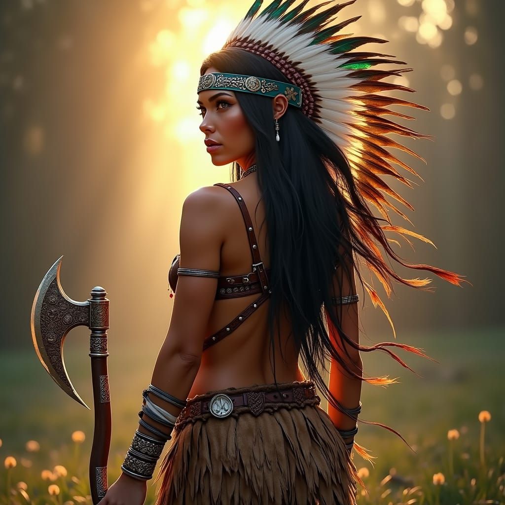 A stunning Native American warrior princess stands proudly, adorned with a vibrant feather head dress and holding a gleaming silver tomahawk, set against a warm, golden light with a deep, rich color palette and hyper-detailed textures.