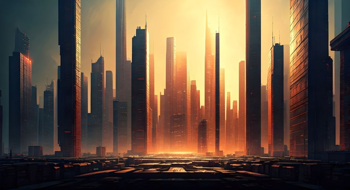 ultra-detailed intricate and colossal cityscape unfolds under warm, volumetric lighting. Towering skyscrapers and neon lights blend into a cosmic, sci-fi tapestry, their vibrant oil paint brushstrokes and deep shadows creating a mesmerizing depth of field. Symmetrical and geometrically precise, the scene ...