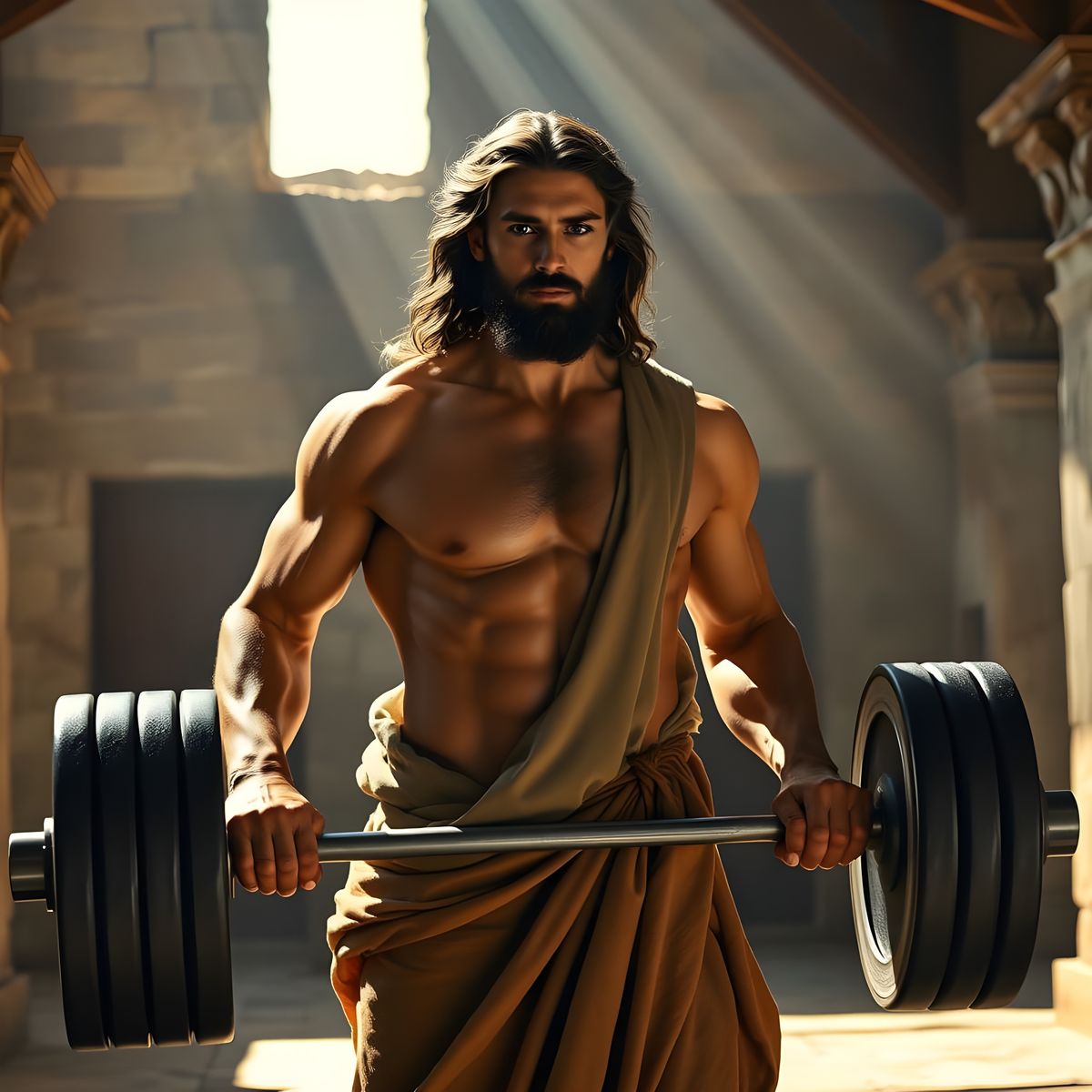 This image depicts Jesus, portrayed with serene strength, performing a heavy deadlift. Rendered with Renaissance realism and dramatic chiaroscuro lighting, it emphasizes spiritual power and anatomical precision.