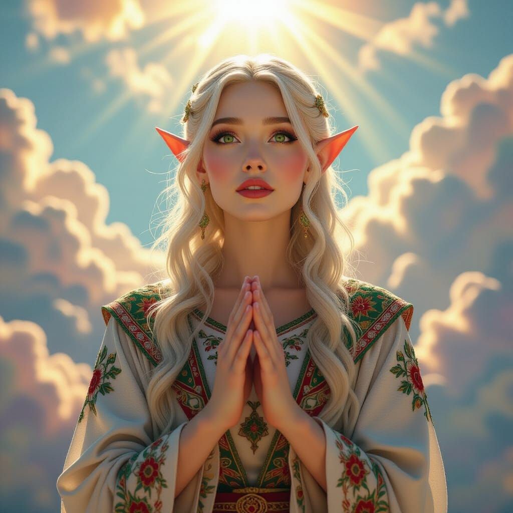 A cinematic still of an albino elf with green eyes, wearing embroidered robes and expressing wonder. The vibrant background features soft clouds and light rays, rendered with dramatic color depth.