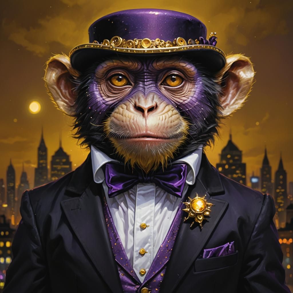 A striking picture of a monkey wearing a tuxedo in a cityscape at twilight. The image features intricate details, volumetric lighting, and a rich color scheme, as 3D rendered digital art.