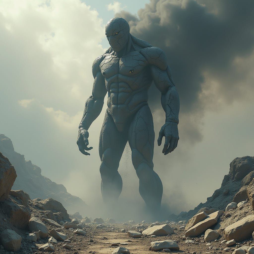 A digital rendering of a cracked stone figure standing amidst destruction. The artwork features vibrant colors and dramatic black smoke, with advanced 3D rendering techniques to enhance depth.