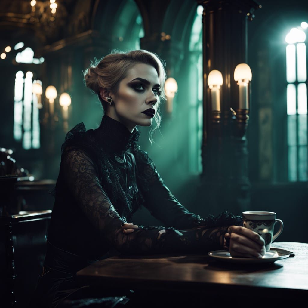 This image shows a goth fashion model in a coffee shop setting. The photography uses high contrast and soft golden lighting to create a cinematic and mysterious atmosphere.
