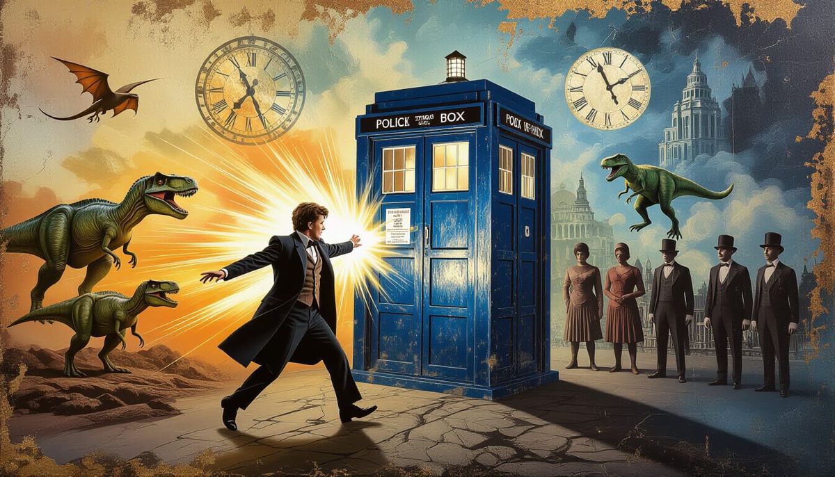 This image shows the Doctor Who character traveling through time in his blue phone booth. Various historical eras flash by in a vintage grunge-textured style with metallic gold overlays.