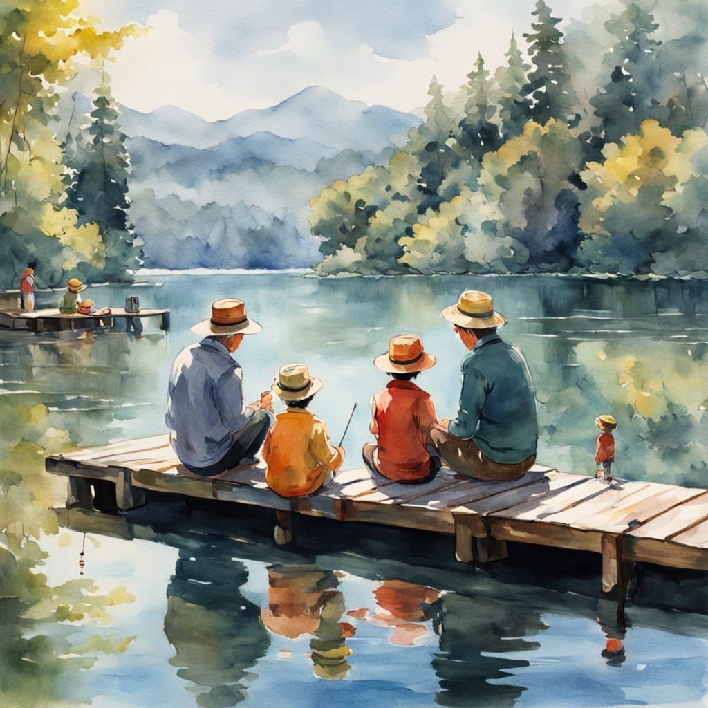 This image shows three generations of a family fishing together from a dock. Soft sunlight reflects on the water in this idyllic scene, rendered as a watercolor anime.