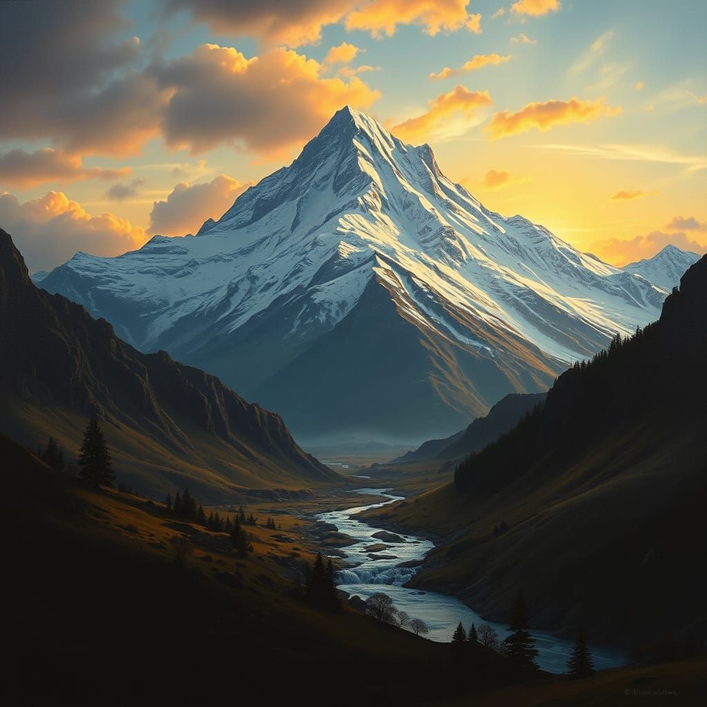 A breathtaking vista of a snow-capped mountain with flowing streams, captured in a baroque aesthetic. The artwork features strong contrasts and dramatic lighting.