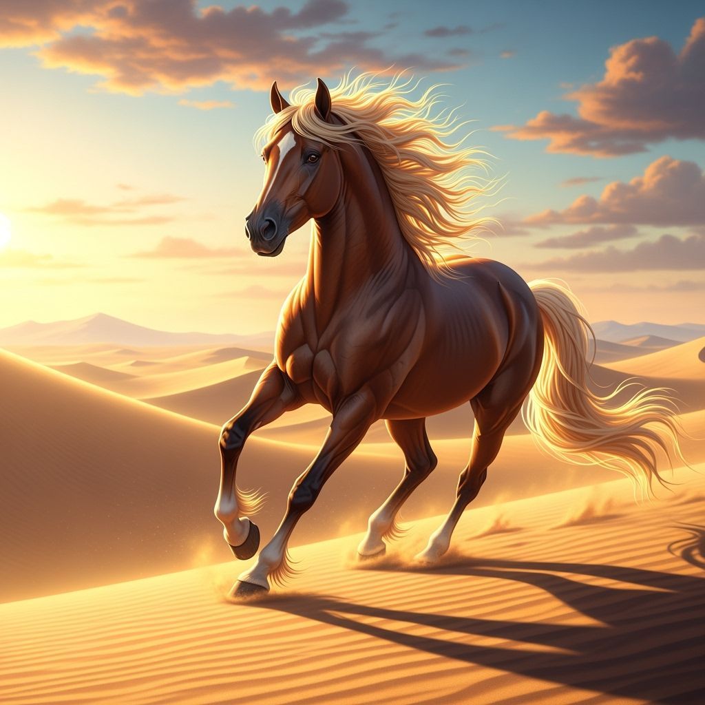 A striking picture of a golden-maned horse galloping across a desert landscape as the sun rises. The hyperrealistic image captures the animal's muscular build and proud expression, enhanced with subtle shadows.