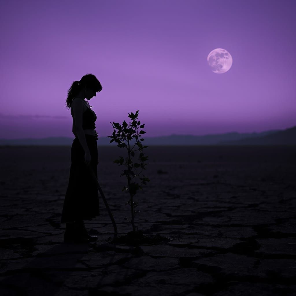 This image shows a lone woman silhouetted in a post-apocalyptic wasteland, caring for a sapling. The bruised purple sky and shattered moon enhance the gritty, high-contrast photorealism of the scene.