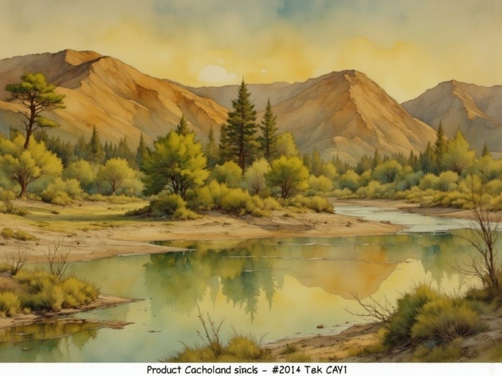 A watercolor painting of the Tabernas River flowing through a landscape with trees. The artwork blends smooth brushstrokes with textures, and displays a comic book art style.
