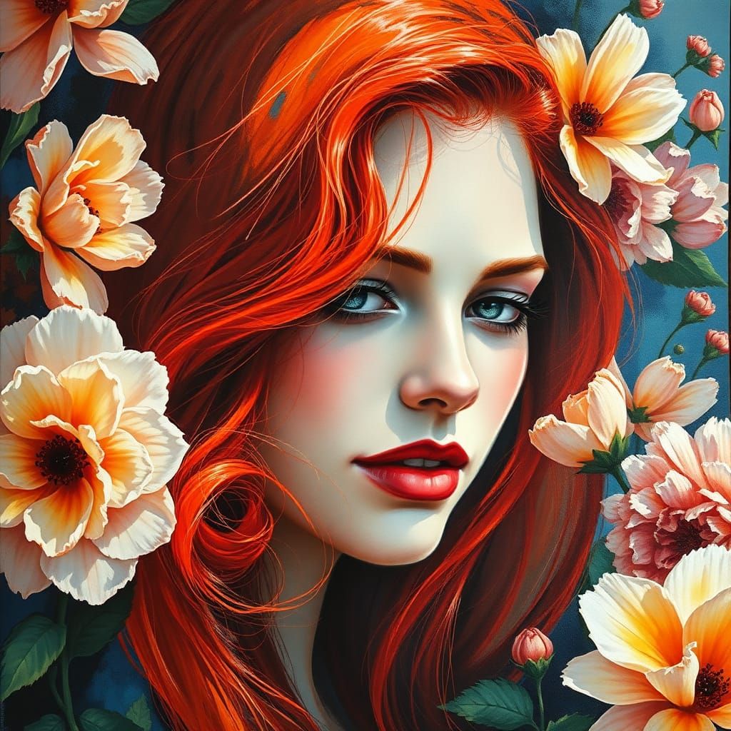 A vivid portrait of a red-haired woman amidst a floral display. This highly detailed charcoal drawing features expressive brushstrokes, layered watercolors and impasto textures in a neo-impressionistic style.