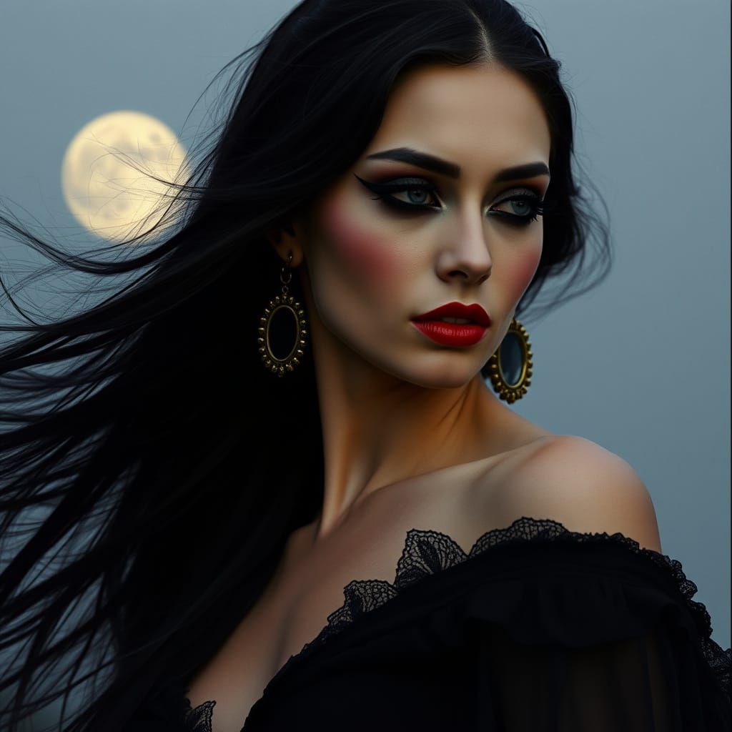 This image shows a stunning female figure with chrome and black makeup, set against a muted grey background with a full moon. The cinematic film still style adds a dramatic and epic atmosphere.