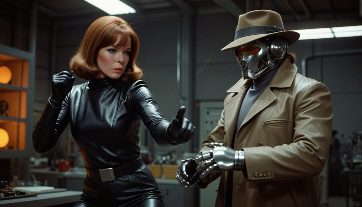 Diana Rigg as Emma Peel fighting a Cybernaut.