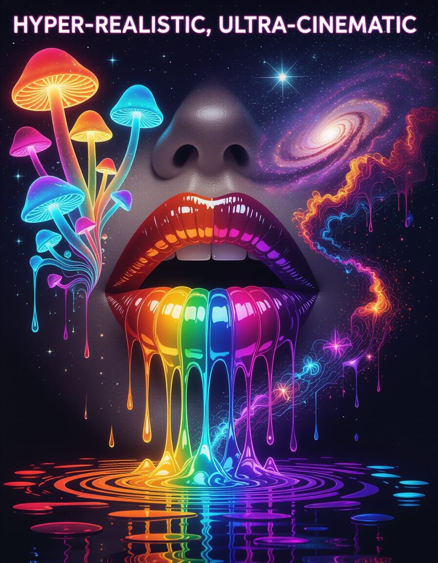 A striking picture of a glossy mouth amidst a cosmic waterfall. Bioluminescent energy and neon liquids cascade around plump lips, creating a portal to a multi-dimensional universe. The image is rendered with ultra-detailed textures.
