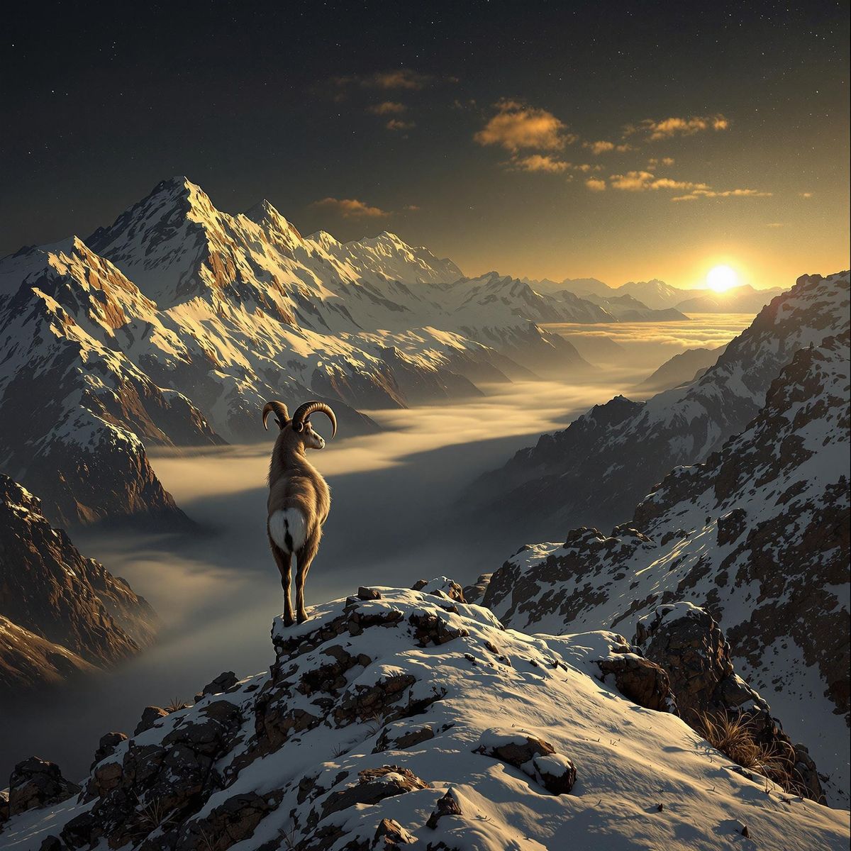 A breathtaking image of a chamois standing on a snowy mountain at night. The scene is illuminated by the setting sun, creating long shadows and a misty valley view, in the style of classical oil paintings.