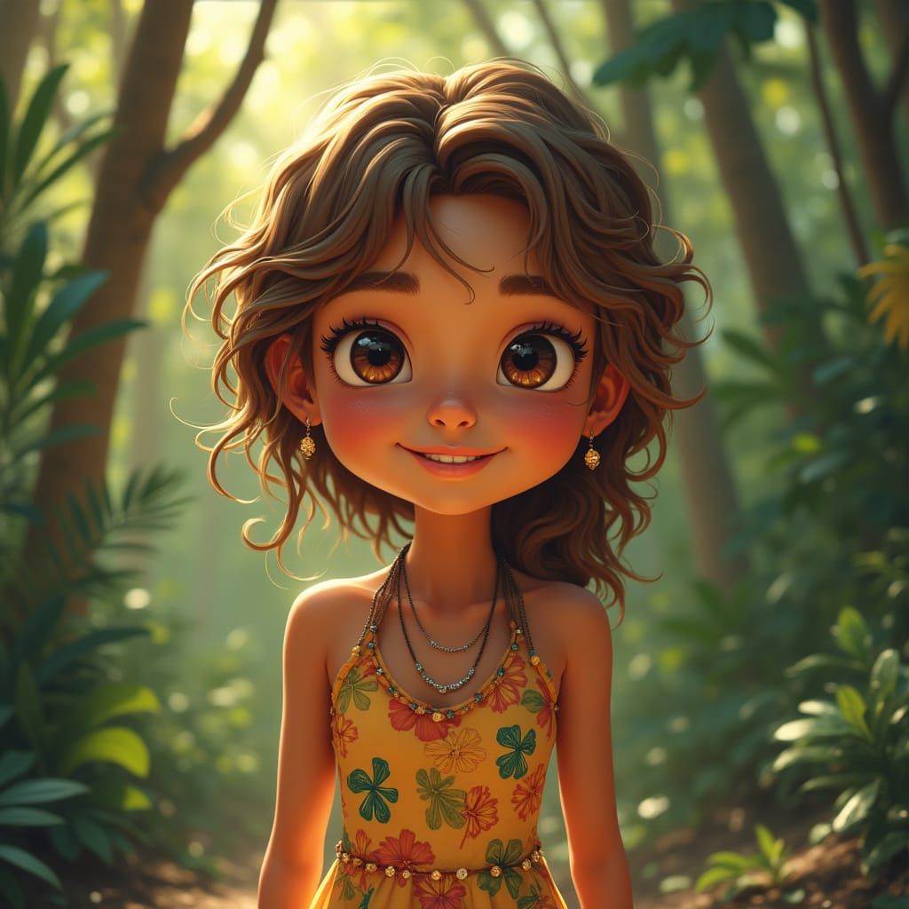A vibrant cartoon of a smiling 10-year-old girl with tan skin and light brown hair, wearing a tropical dress. The image employs a detailed matte painting technique with deep colors.