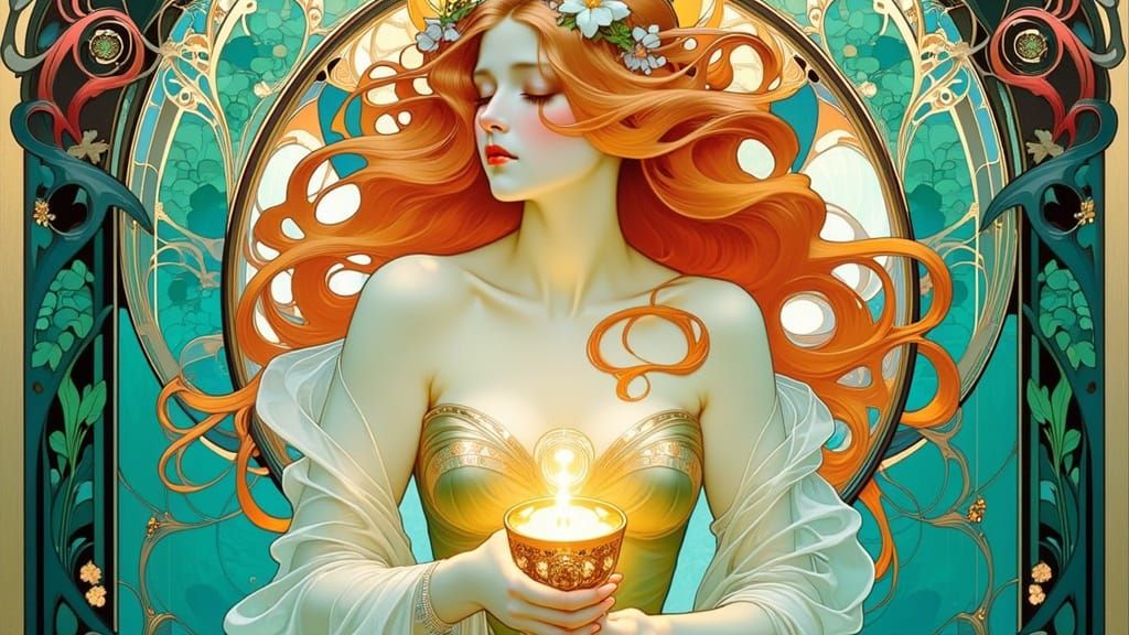 This image showcases a graceful mermaid with flowing hair holding a glowing chalice, presented in an elegant Art Nouveau poster style with flat, luminous color blocks.