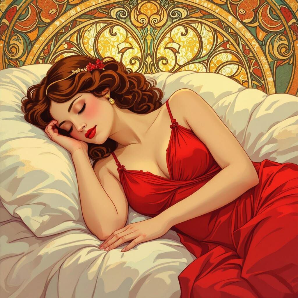 This image shows a curvaceous woman sleeping peacefully on a plush bed. She is wearing a vibrant red dress, rendered with intricate patterns and soft, golden lighting, in a nouveau art style.