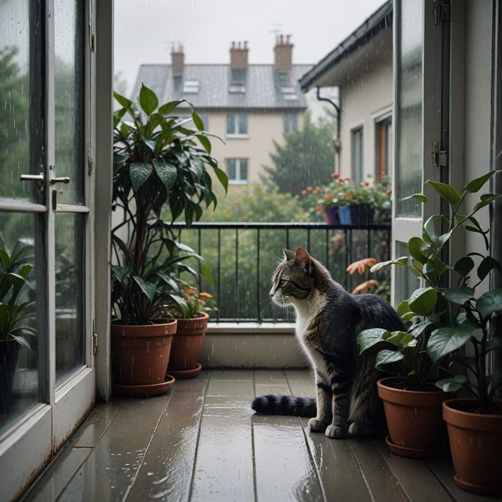 This image shows rain-streaked glass balcony doors with a cat visible inside. Warm indoor light contrasts with the cool, misty rain outside, creating a comforting, soft-focus atmosphere.
