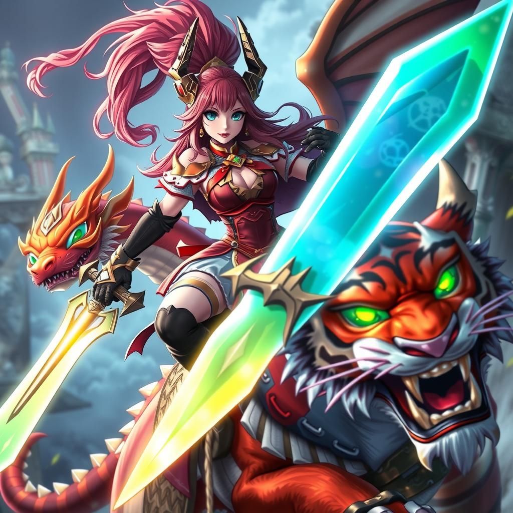 A digital painting of a dragon-woman riding a tiger into battle. The artwork showcases vibrant colors, extreme detail and a luminous background to create a dramatic effect in a 3D anime art style.