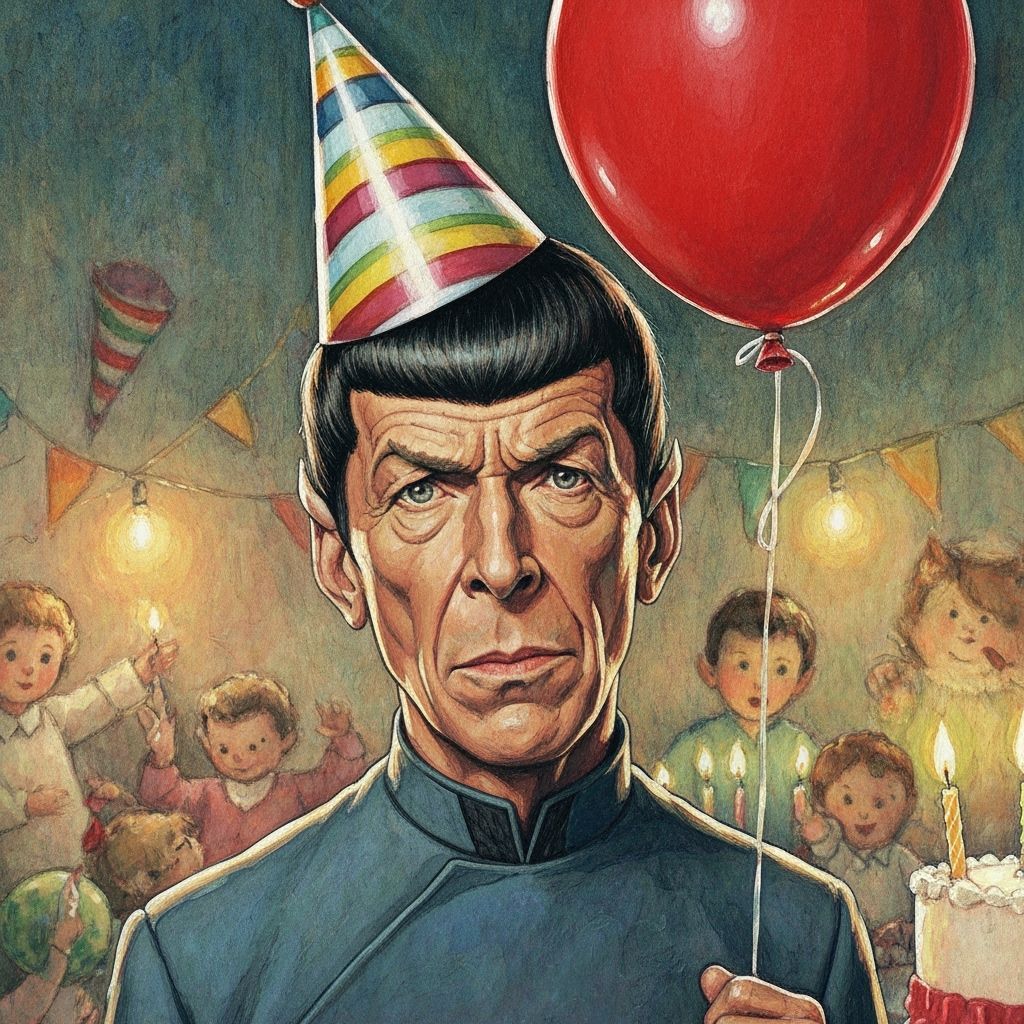 This makes me giggle! Spock in a party hat! (I imagine Amanda put one on his a time or two when he was growing up.) Congratulations!