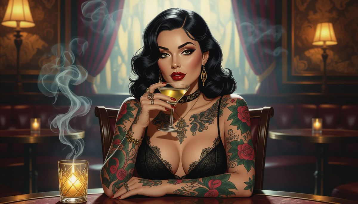 This image shows a gothic woman with tattoos in a smoky jazz club, sipping a martini. The artwork evokes a vintage poster style with warm golden lighting and a luxurious ambiance.