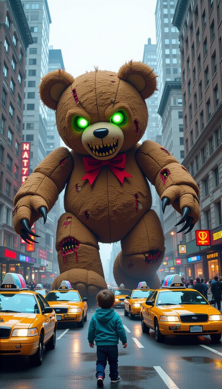 [In style of Jeff Soto a Decaying cartoon of a massive alien teddy bear walks over new york city, playing with taxis as if they were toys in shape of zombie, ] toy stitched with sharp teeth and claws, neon zombie, radioactive, highly realistic character, highly detailed photography. Cinematic universe ...