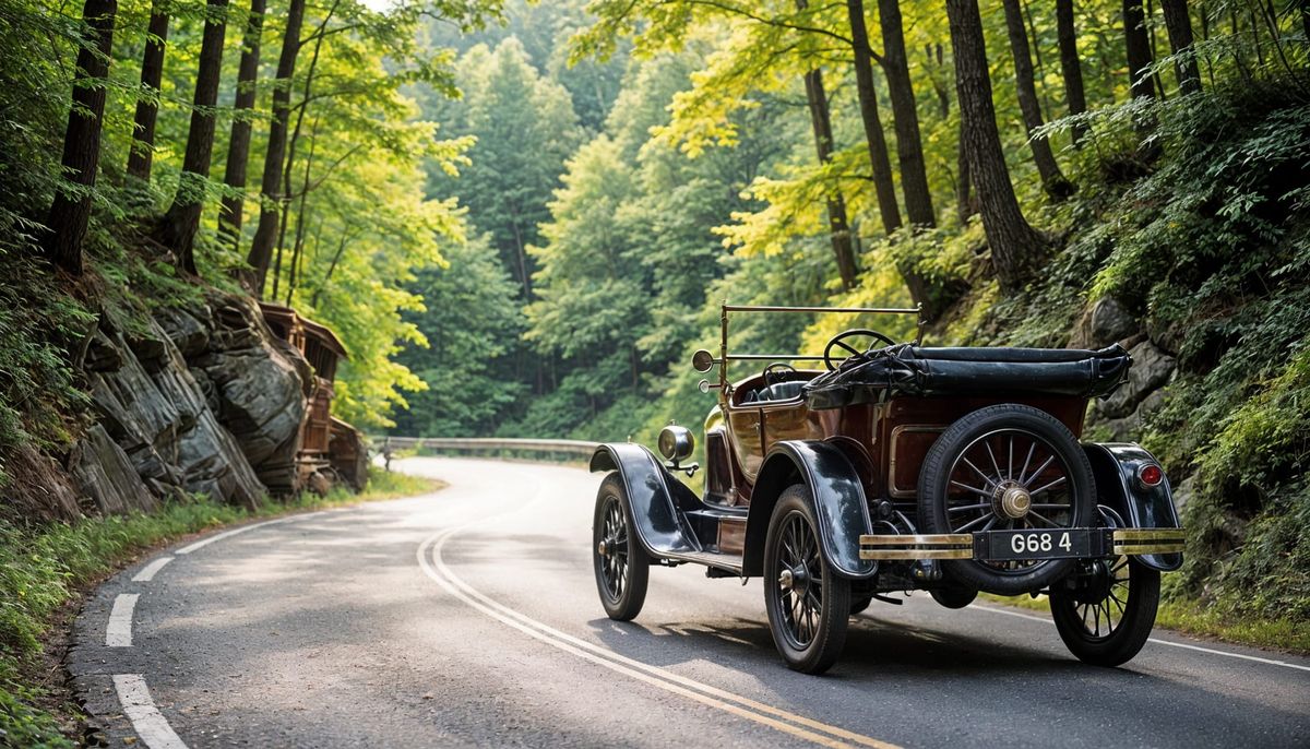This image features a vintage 1914 automobile driving on a scenic, winding road through a wooded gorge. Captured with professional photography techniques and natural lighting.