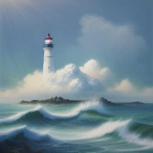 A serene image of a lighthouse using Sumi-e painting techniques. The picture features soft focus, gentle clouds, warm light rays, and pastel colors, evoking a watercolor aesthetic with soft gradients.