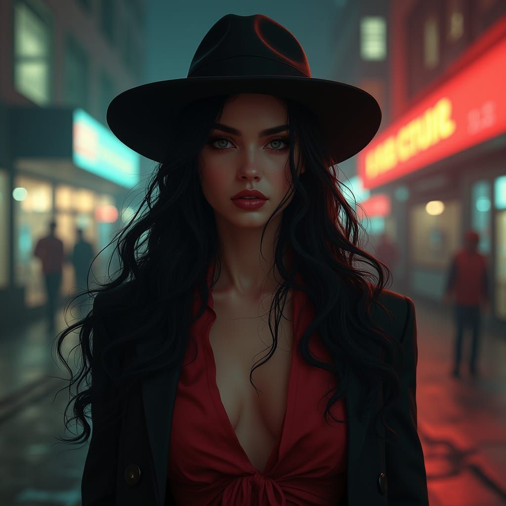 This image shows a cell-shaded illustration of an Italian woman dressed as a mobster. The scene is reminiscent of Grand Theft Auto loading screens, with deep colors and fantasy concept art elements.