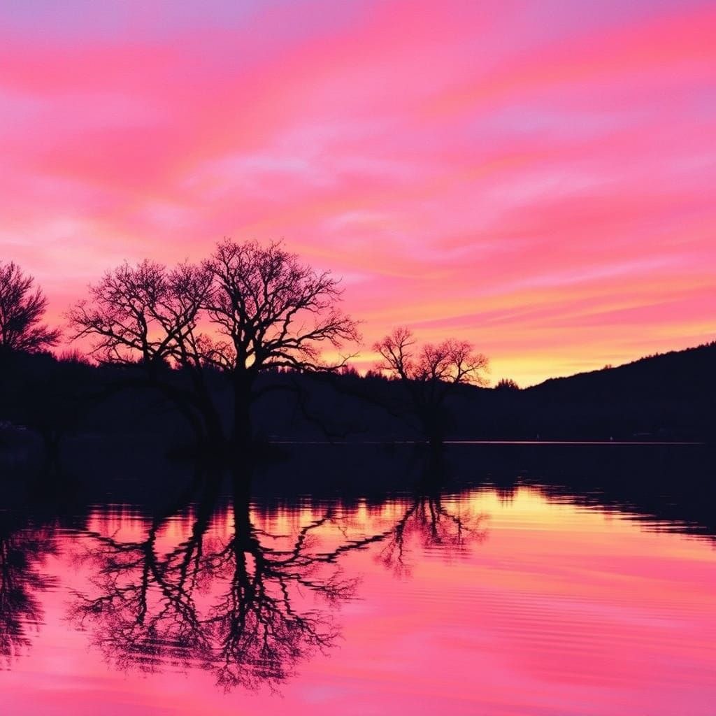 This image captures a serene lake at sunset, reflecting vibrant pink, orange, and purple hues of the sky, with delicate tree silhouettes and intricate details reminiscent of traditional Japanese woodblock prints, blended with abstract expressionist brushstrokes and the dreamy quality of color fields, cre...