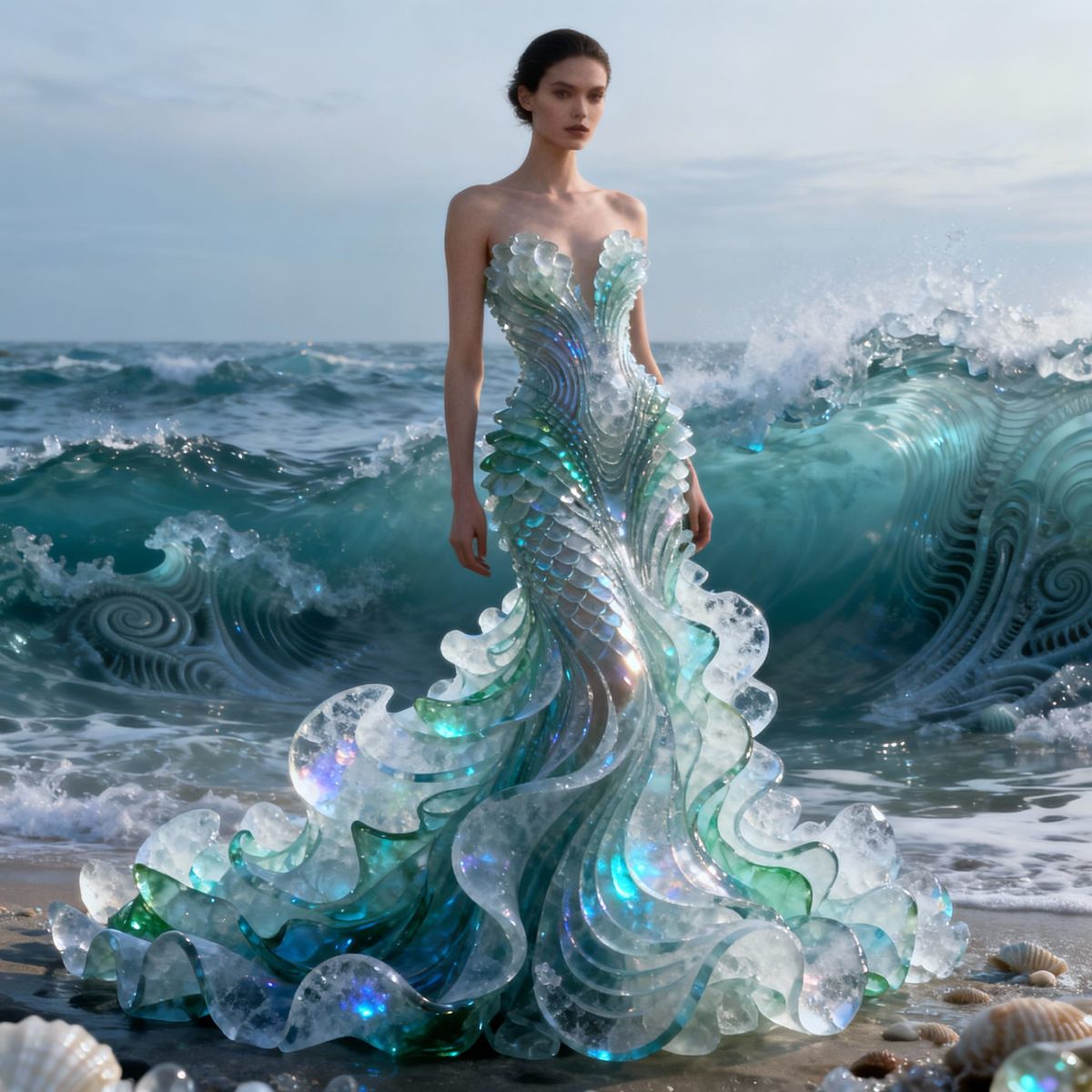 This image showcases a stunning haute couture gown resembling flowing waves of frosted sea glass. It features bioluminescent highlights and an iridescent texture in a dreamy, aquatic color palette.