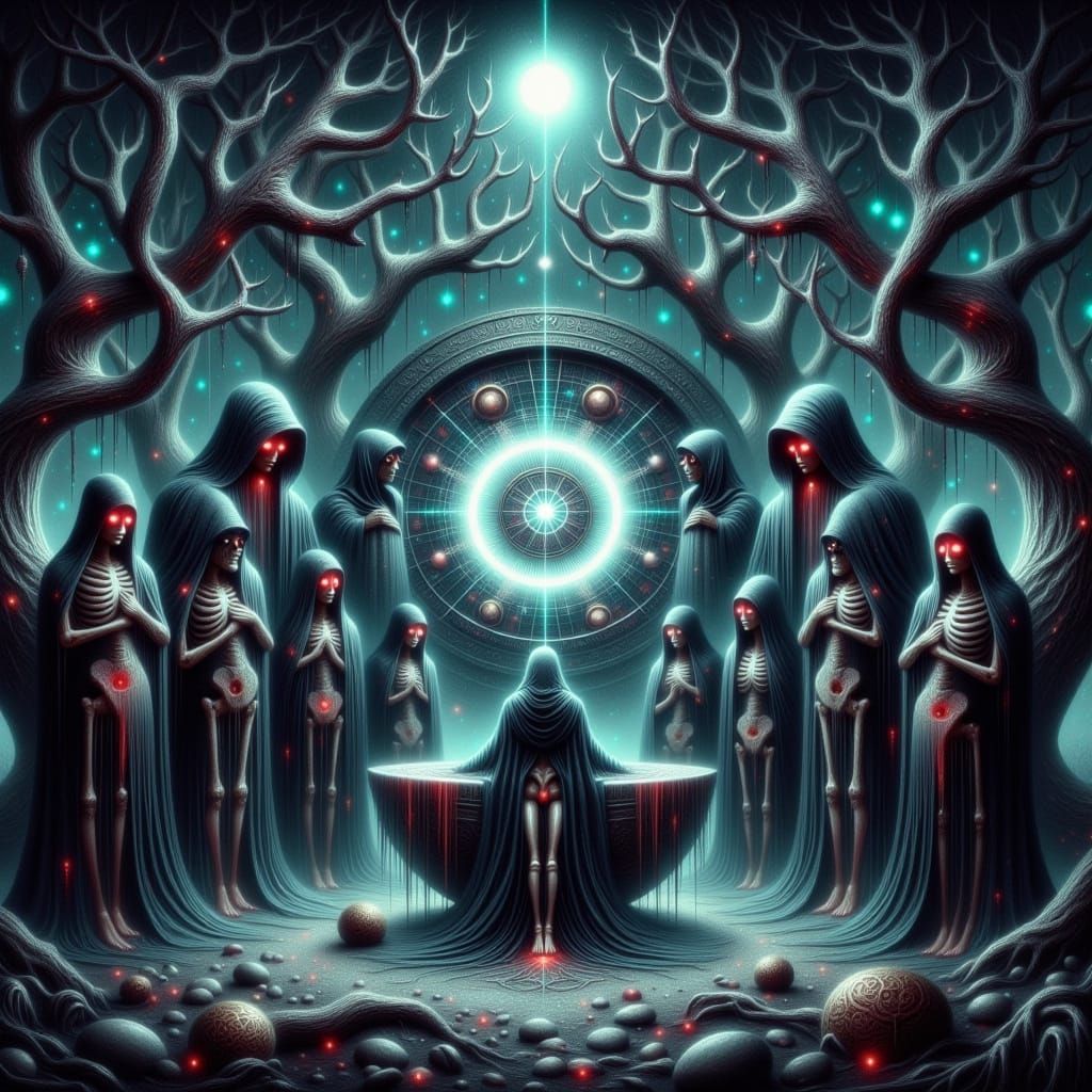 This image shows a haunting and ominous depiction of the Black Zodiac, set amidst a dark, misty atmosphere with ancient trees and a glowing, ethereal wheel. The scene is inspired by the works of Zdzisław Beksiński, H.R. Giger, and Francis Bacon, with a focus on dark, twisted, and macabre elements.