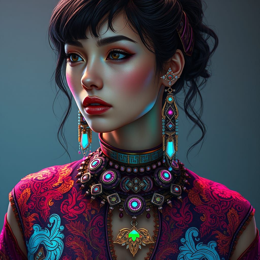 This image shows a woman in colorful, embroidered clothing and futuristic jewellery. The hyperrealistic digital artwork features metallic accents and neon lights.
