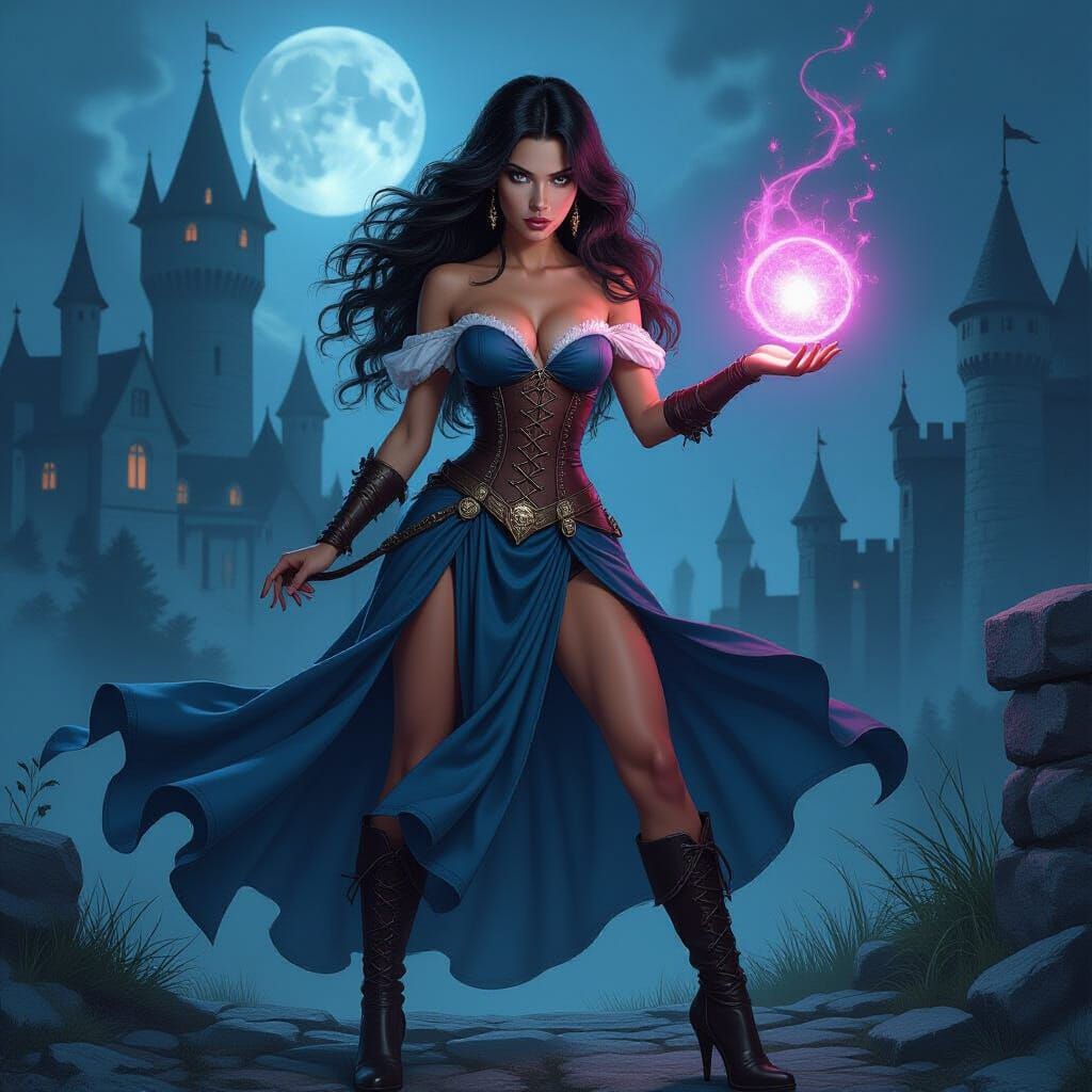 A dramatic image of a warrior princess casting magic at night. This digital painting features dramatic lighting and intense colors in a dark fantasy aesthetic with mystical realism.