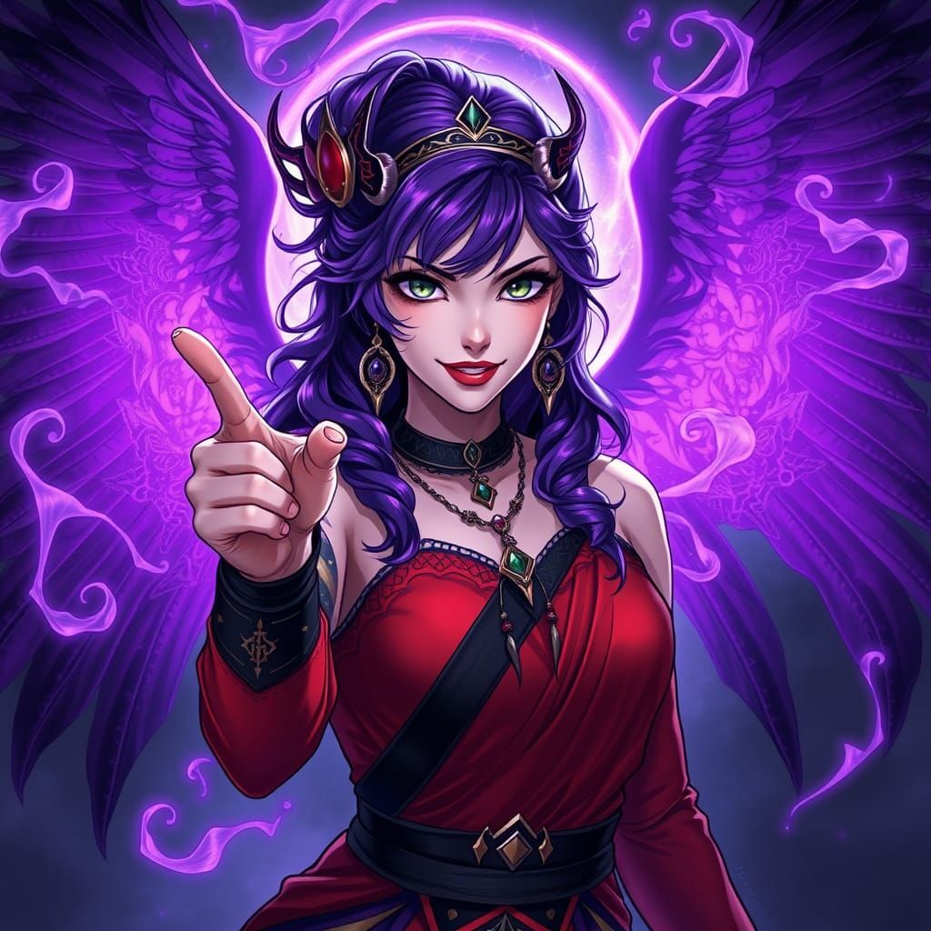 This image shows a mystical woman with vibrant purple hair and piercing green eyes, beckoning with an enigmatic smile. Her majestic wings and swirling patterns unfold behind her, surrounded by a halo of purple energy with a smoky effect. She wears a striking red and black outfit, blending ancient and mod...