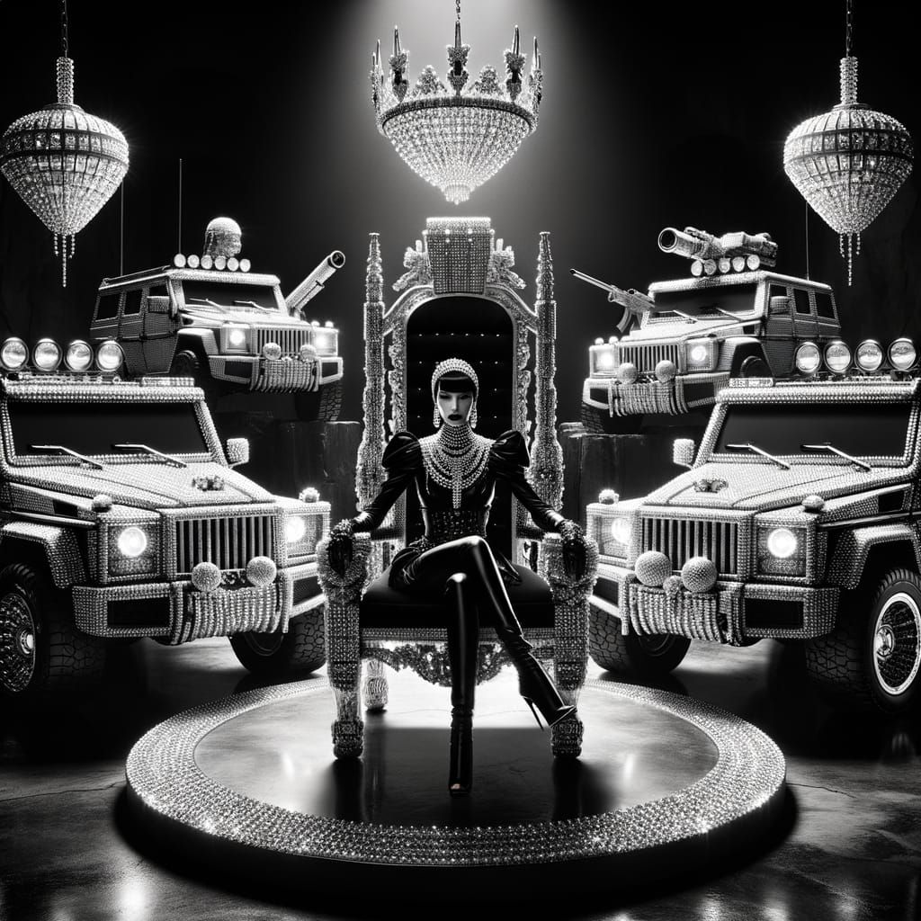 A striking picture of a leather-clad robber queen on her throne. Armored vehicles surround her fortress in this surreal black and white digital art piece with diamond accents.