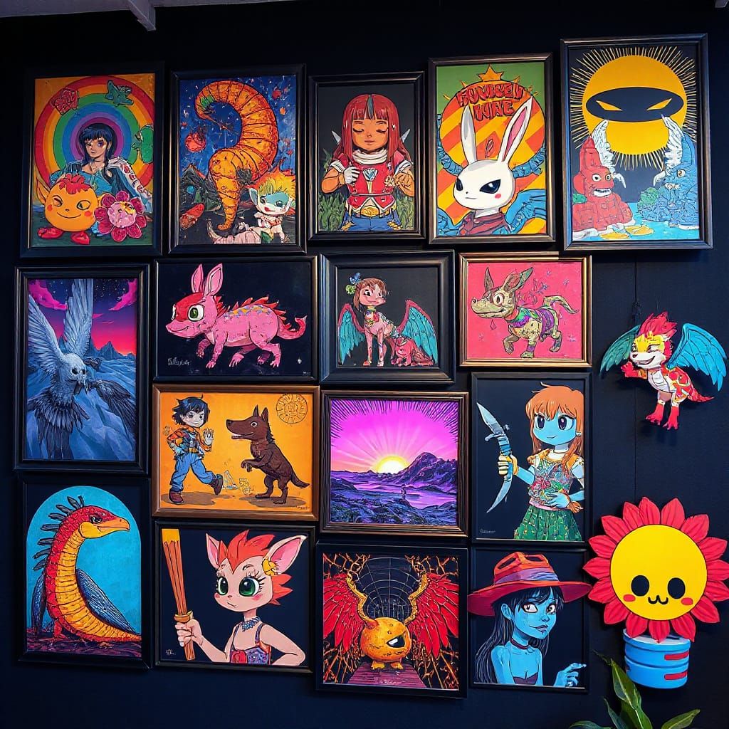 A showcase of diverse artworks from a digital art community. The pieces feature bold colors and dynamic compositions, reminiscent of modern digital art styles.